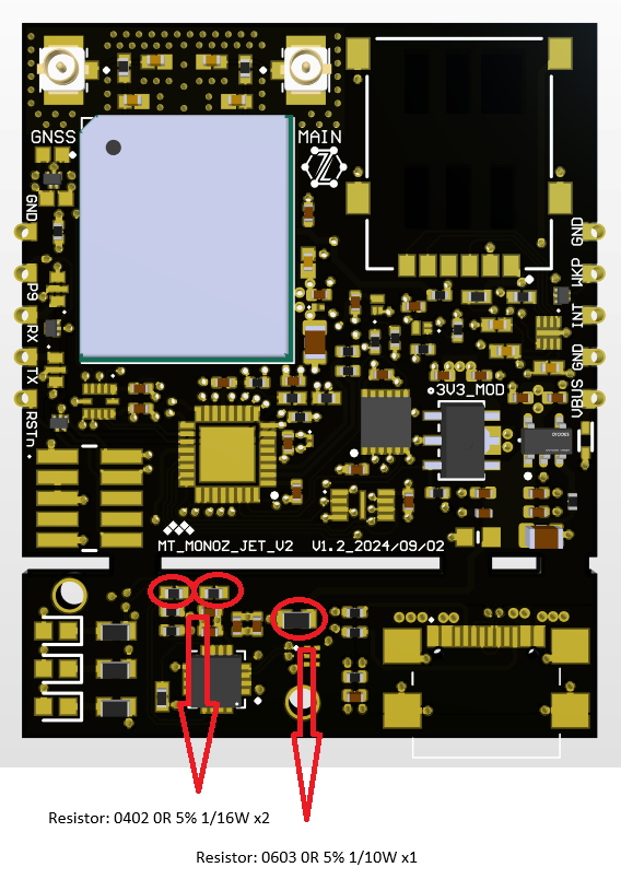 Method 2: Remove the three resistors shown below to disconnect the communication line between the USB and the processor. In this method monoZ:Jet can be switched back to USB mode by remounting the resistors in their original positions. Meritech strictly disclaims any responsibility for hardware issues, including malfunction of monoZ:Jet caused by removal or reinstallation of resistors.