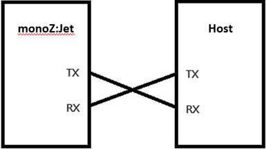 Once hardware is prepared, monoZ:Jet can be accessed via UART by connecting p7,p8 of cascade connector J1 to RX & TX of the host. This enables UART as the data channel for monoZ:Jet. In UART mode, monoZ:Jet can be powered by connecting p1, p2 of connector J2 to 5V DC power input and GND.