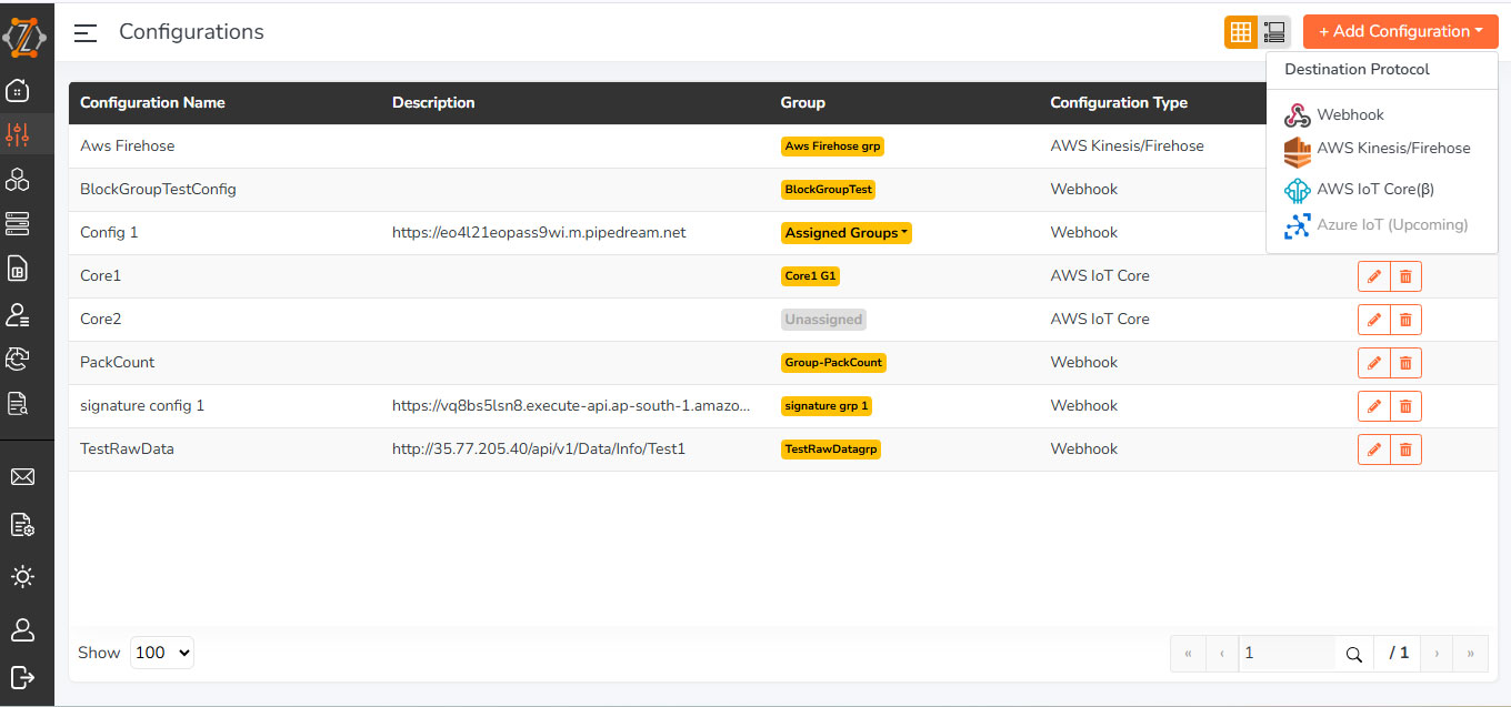 Navigate to “Configuration” -> “Add Configuration” -> "Webhook". Add the destination server details and create the configurations.